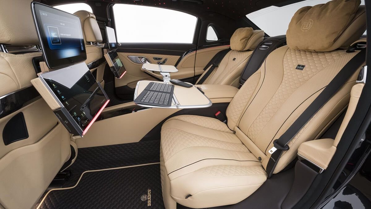It sits 15mm lower thanks to the ‘lowering module’, and the inside is basically whatever your little heart desires. This one pictured is an example of what you can achieve: seat perforations machined for optimum ventilation (handy with 888bhp on tap), the optical fibre headlining, tables, Micrcosoft Surface 4 Pro tablets, a 3.5in screen integrated into the armrest between the rear seats…