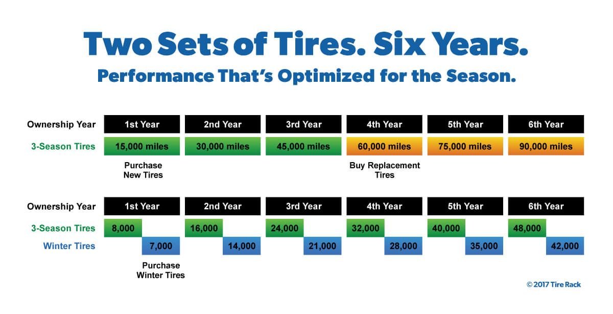 About now you’re thinking what these dedicated winter tires will cost you. Consider this. Over the course of six years of vehicle ownership, you’ll likely need to replace your tires after year three. That’s two sets of tires in six years. Tire Rack recommends that drivers who will need the added traction from winter tires for some of the year purchase them the first year. Your three-season tires are in storage while your winter tires are on the road. The expense is the same. And you’re driving on tires optimized for the season you’re in. Here’s how this plays out: